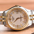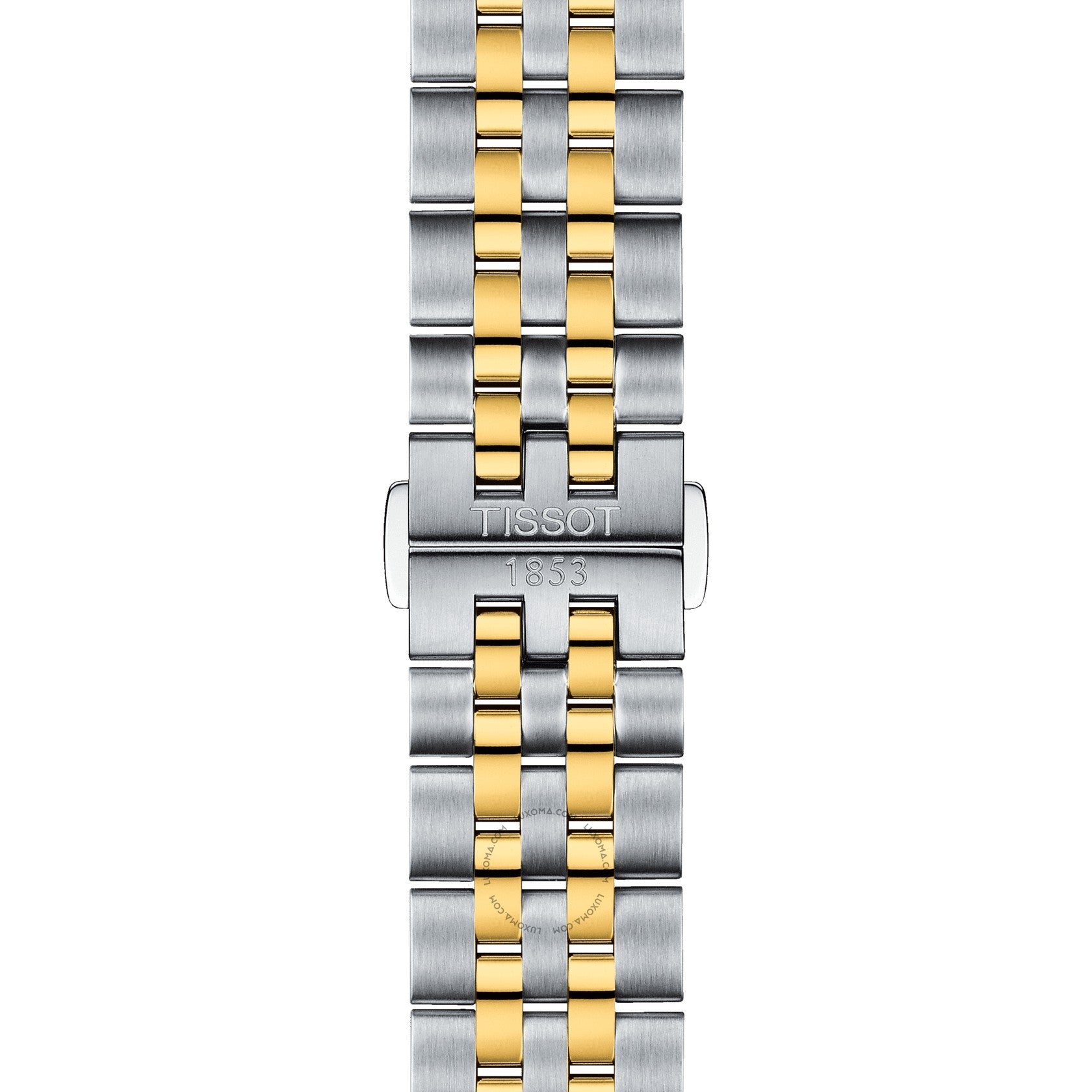 The watch face is divided into 3 distinct rings and is harmoniously designed with a blend of gold tones in the necessary details on a white background, making it stand out, easier to see and more luxurious. The minute markers are located on the outermost part of the watch face. Interspersed with the markers are even 5-minute numbers. The middle ring is the hour markers with a more modern Arabic numeral and bar system compared to the classic Tissot Le Locle. Tissot watch brand and the year of establishment 1853 is placed at the 12 o'clock position, which is quite recognizable and wants to emphasize the brand's history.
