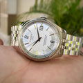 Light dial and bezel complemented by a laconic pattern, the classic model will be appropriate in any situation. Inside the case made of durable 316L stainless steel is an automatic caliber Powermatic 80with an 80-hour power reserve, thanks to its impeccable precision, the watch is marked COSC certificate. Skeletonized back cover. Reliable sapphire glass. Golden PVD coating scratch and abrasion resistant. Water resistance 50 meters. Date aperture. . Dimensions: 39 x 41 x 9.8 mm.