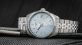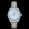 Combining timeless sophistication with modern innovation. The centrepiece of this elegant timepiece is its captivating blue dial, enhanced with silver-tone hands and slender hour markers, offering a refined yet striking aesthetic. Encased in a robust stainless-steel case, this watch is powered by a quartz movement, ensuring unparalleled accuracy and dependability. The bracelet, crafted from polished stainless steel, integrates flawlessly with the design, providing both durability and comfort. A blend of both precision and beauty, this timepiece is an exquisite statement of modern luxury.