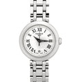 26mm stainless steel case, white sunburst dial with roman numeral hour markers. Quartz movement, sapphire crystal glass and water resistant to 50m. Presented on a stainless steel bracelet.