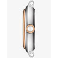 26mm stainless steel and rose gold PVD case, white sunburst dial with roman numeral hour markers. Quartz movement, sapphire crystal glass and water resistant to 50m. Presented on a stainless steel and rose gold PVD bracelet.