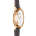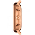 Rose gold PVD stainless steel case with a brown leather strap. Fixed rose gold PVD bezel. White dial with rose gold-tone hands and index hour markers. Minute markers around the outer rim. Dial Type: Analog. Date display at the 4 o’clock position. Chronograph – three sub-dials displaying: 60 second, 30 minute and 1/10th of a second. ETA caliber G10.212 quartz movement.