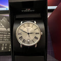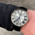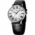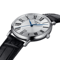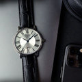 A men's Swiss-made quartz watch with scratch-resistant sapphire crystal, silver dial with Roman numeral indices and black leather strap.