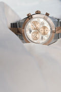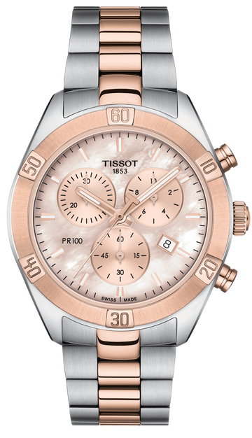 The Swiss watch Tissot Pr 100 Sport Chic Chronograph T101.917.22.151.00 from the T-CLASSIC collection is an exquisite classic with a beautiful aesthetic that is the epitome of luxury and traditional classic style. The watch has a light mother-of-pearl dial with pink luminous indices, hands and a date window. Pink mini chronograph displays complement the design with stylish splashes. The presence of a golden-pink bezel adds a touch of luxury to the accessory. This beautiful and elegant model with a 6-jewel ETA G15.212 quartz movement is equipped with a chronograph and is highly water-resistant to 10 bar. In addition, it is equipped with a sapphire crystal, which protects the dial from damage. The steel case with pink crowns is uniquely complemented by a two-tone stainless steel bracelet with a folding clasp with push-buttons. Case size 38mm, 10.5mm, weight 139g.