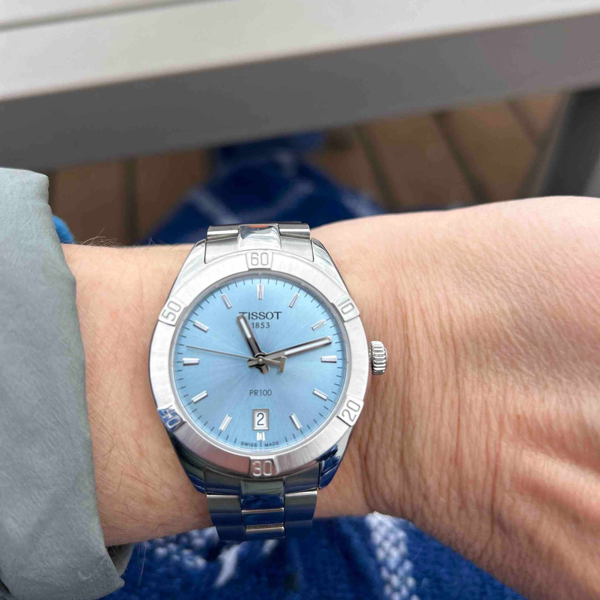 Elevate your everyday style with the Tissot PR 100 Sport Chic Lady. This Swiss-made timepiece features a stunning blue dial that captures light beautifully, paired with a polished silver steel bracelet for a sophisticated finish. The 36mm case offers the perfect balance of presence and wearability, while the quartz movement ensures reliable timekeeping. Water-resistant to 100 meters, it's ready for daily adventures. The clean dial design with applied indices makes reading the time effortless. A versatile companion that transitions seamlessly from office to weekend, this Tissot watch combines sporty elegance with timeless appeal.