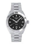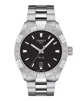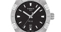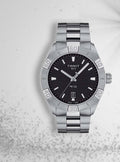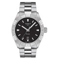 Sport watches swiss watches Tissot T-Classic PR 100 Quartz, Vode odolnosť 100M, 42 mm. The watch has functions luminescence, date and E.O.L.. Basic parameters of the watch are: dial colour is black, movement type is Quartz watches, strap material is steel and water resistance is 100 m.