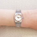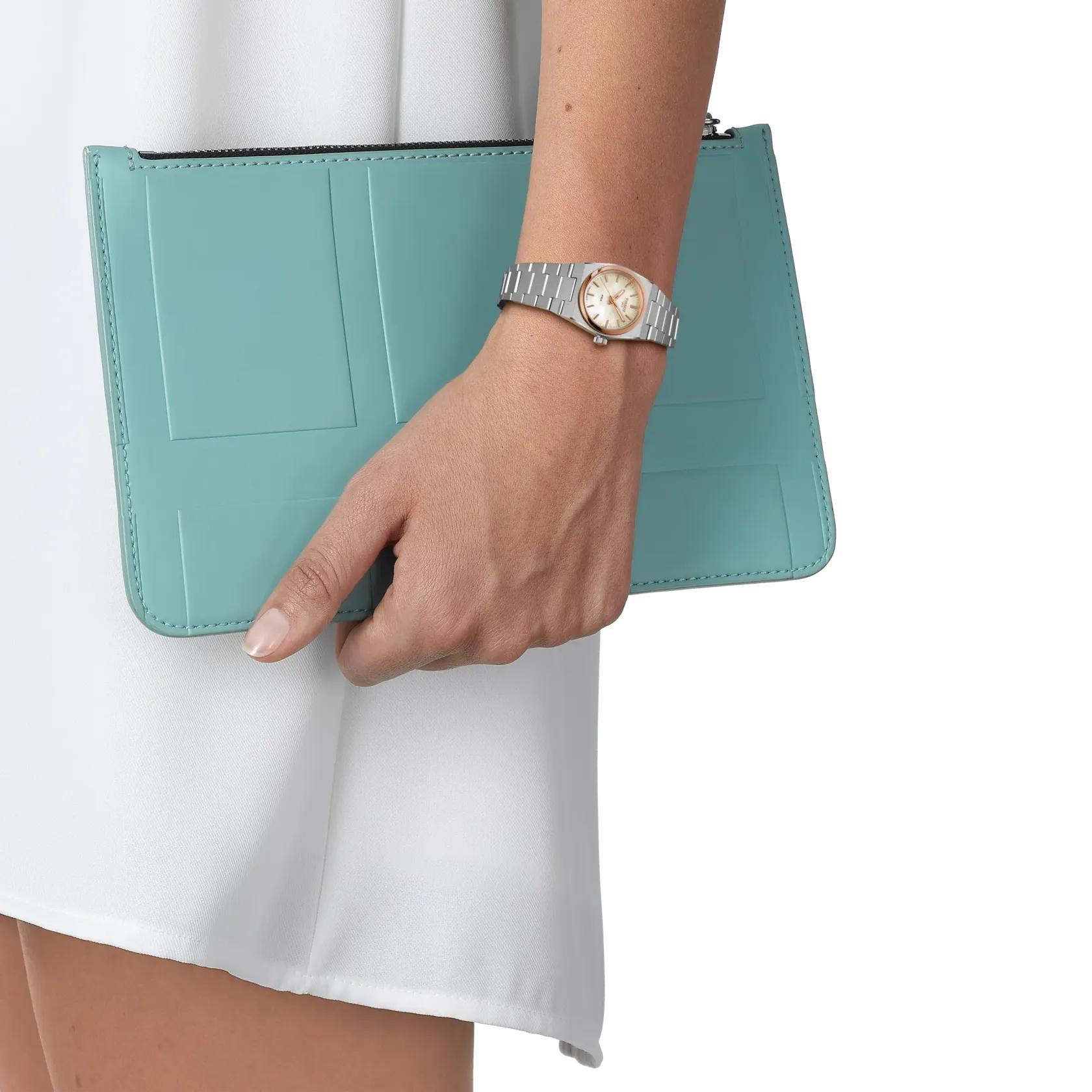 The Tissot PRX women's watch also features a convenient date display window at 3 o'clock, allowing you to keep track of the date at a glance. The fold-over clasp ensures a secure and comfortable fit on your wrist, making this watch perfect for everyday wear.