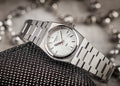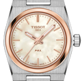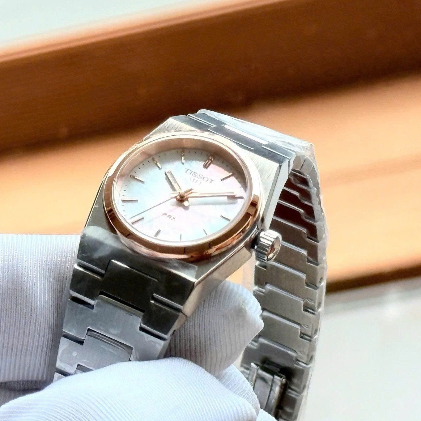 The Tissot PRX combines timeless elegance with modern precision. This women's timepiece features a stunning mother-of-pearl dial that catches the light beautifully, paired with a sleek silver steel bracelet. The PRX collection is known for its distinctive design and Swiss-made quality, offering reliable quartz movement in a sophisticated package. Perfect for everyday wear or special occasions, this watch delivers both style and dependability. Water-resistant and built to last, it's an investment piece that complements any wardrobe.