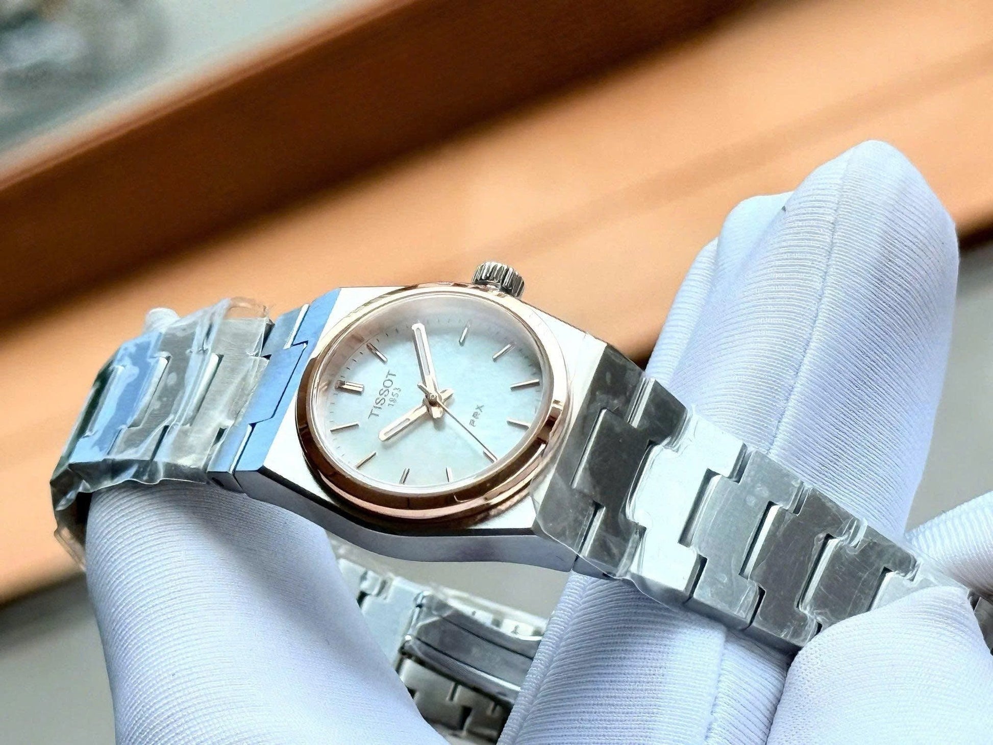 • Elegant Design: The Tissot PRX women's watch features a sleek stainless steel case and bracelet, complemented by a stunning blue dial. The minimalist design is perfect for both casual and formal occasions.