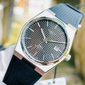 Silver-tone stainless steel case with a black rubber strap.