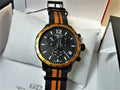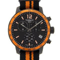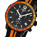 Black PVD stainless steel case with a black and orange synthetic nylon strap. Fixed black PVD bezel with an orange top ring showing tachymeter markings. Black dial with luminescent hands and index hour markers. Arabic numeral marks the 12 o'clock position. Minute markers around the outer rim. Dial Type: Analog. Luminescent hands and markers. Date display at the 4 o'clock position. Chronograph - three sub-dials displaying: 60 second, 30 minute and 1/10th of a second. Quartz movement. Scratch resistant sapphire crystal. Solid case back. Case diameter: 42 mm. Round case shape. Tang clasp. Water resistant at 100 meters / 330 feet. Functions: chronograph, date, hour, minute, second. Sport watch style. Watch label: Swiss Made. Tissot Quickster Chronograph Black Dial Black and Orange Synthetic Nylon Mens Sports Watch T0954173705700. Comes with an extra, all black, nylon strap.