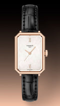 The new Tissot SRV watch combines Art Deco inspiration with a reinterpreted 1970s design. It features a precise quartz movement with an end-of-life indicator, a faceted rectangular sapphire crystal, and 5 bar water resistance. Its leather strap adapts over time for a unique fit, while the mother-of-pearl dial adds timeless elegance and style.