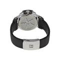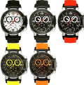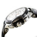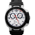 Stainless steel case with a black rubber strap. Fixed black ion-plated bezel. White dial with luminous hands and index hour markers. Arabic numerals mark the 6, 9, and 12 o'clock positions minute markers. tachymeter markings. Dial Type: Analog. Date display at the 3 o'clock position. Chronograph - sub-dials displaying: three: 1/10th seconds, 30 minutes, 60 seconds sub dials. ETA Caliber G10.211 quartz movement.