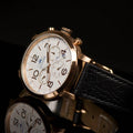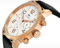 Rose gold-tone stainless steel case with a black leather strap. Fixed rose gold-tone bezel. White dial with luminous rose gold-tone hands and alternating Arabic numeral and index hour markers. Minute markers. 24 hour markers around the outer rim. Dial Type: Analog. Luminescent hands. Date display at the 6 o'clock position. Three multi-function sub-dials displaying: date, day of the week, and 24 hours.