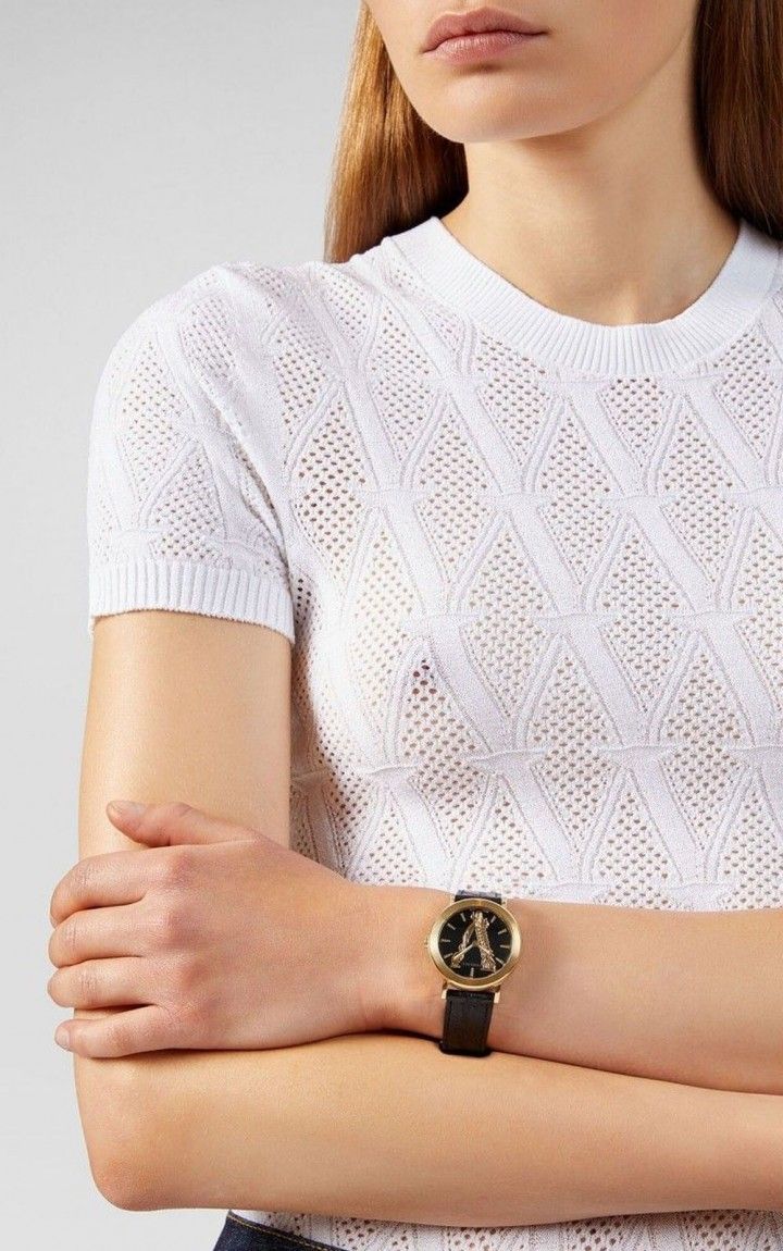 Yellow gold-tone stainless steel case with a black (calfskin) leather strap. Fixed yellow gold-tone bezel. Black (Barocco V) dial with yellow gold-tone hands and index hour markers. Dial Type: Analog. Quartz movement. Scratch resistant sapphire crystal. Pull / push crown. Solid case back. Round case shape. Case size: 36 mm. Case thickness: 8.5 mm. Band width: 18 mm. Butterfly clasp. Water resistant at 50 meters / 165 feet. Functions: hour, minute. Virtus Series. Dress watch style. Watch label: Swiss Made. Versace Virtus Quartz Black Dial Black Leather Ladies Watch VEHC00119.